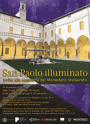 PARMA – Mercoledì 29 dicembre 2021 il Comune di Parma organizza “San Paolo illuminato. Cultura ed eccellenza agroalimentare”: visite guidate gratuite dalle 17 alle 20.30, che permetteranno a turisti e cittadini di ammirare la Camera di San Paolo e di percorrere gli spazi illuminati del Chiostro della Fontana, rinnovati nel recente restauro.