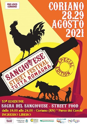 CORIANO (RN) – Per l’ultimo weekend di agosto Coriano prepara un programma spumeggiante con il Sangiovese Street Festival, l’appuntamento che Pro Loco Coriano, in collaborazione con l’Amministrazione Comunale, organizza per conoscere i vini più prestigiosi della provincia di Rimini, in una festa del gusto e dello spettacolo di strada e del wellness, in programma sabato 28 e domenica 29 agosto al Parco dei Cerchi.
