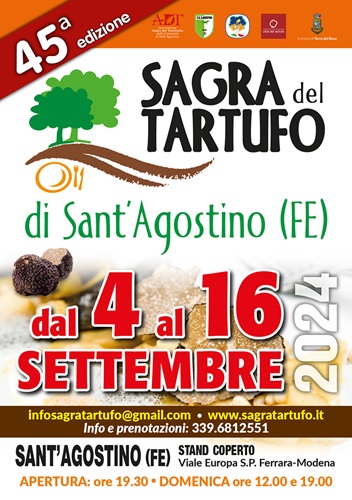 Sant’Agostino fa parte dal 2009 dell’Associazione Nazionale Città del Tartufo: un legame antico e profondo che affonda le sue radici nell’origine alluvionale dei terreni e nella presenza di essenze arboree adatte alla sua crescita; e così la Sagra dedicata al pregiato tubero, giunta alla 45esima edizione, farà rivivere come per magia il vincolo inscindibile tra la comunità locale, l’area naturale che la circonda e l’esperienza nella preparazione di ricette che esaltano un prodotto dal profumo e dal sapore inconfondibili, fra i più amati a ogni latitudine.