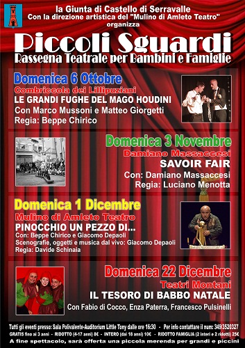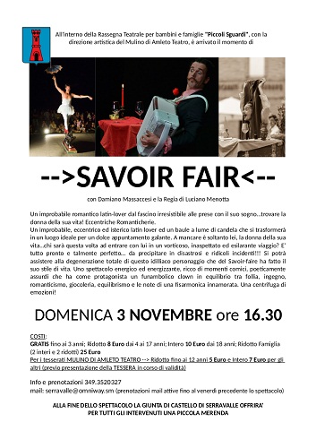 VALSAMOGGIA (BO) – All’interno del progetto “PICCOLI SGUARDI” (rassegna teatrale per bambini e famiglie), organizzato dalla Giunta di Castello di Serravalle con la direzione artistica del “Mulino di Amleto Teatro”, e in collaborazione con la Combriccola dei Lillipuziani domenica 3 Novembre alle 16.30, presso la Sala Polivalente – auditorium Little Tony di Serravalle, sarà in scena Damiano Massaccesi con l’esilarante spettacolo “SAVOIR FAIR”, regia di Luciano Menotta.