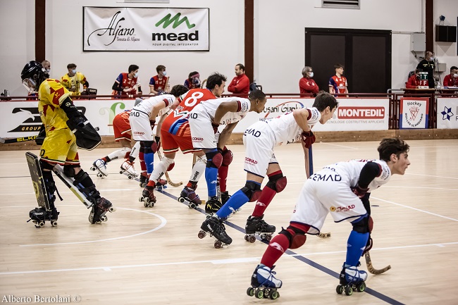 SCANDIANO (RE) – Seconda sconfitta nella fase di qualificazione della Coppa Italia A2 per il Roller Hockey Scandiano. I rossoblu vengono sconfitti per 6-4 dal Correggio ed in classifica rimangono a tre punti ma non compromette la possibilità di giocarsi la seconda fase. Botta e risposta immediato nel derbyssimo: prima Caroli firma il 0-1 poi il viareggino Deinite fissa il pareggio 1-1. Barbieri mette la freccia al 6° minuto realizzando un tiro diretto ma Caroli ancora pareggia realizzando, a 7 minuti dalla sirena, un tiro di rigore. Poco dopo Ferrari firma il 2-3 in ribattuta sulla prima parata di Dimone. Il secondo tempo inizia con un tiro diretto fallito da Barbieri al 2°minuto ma Ehimi pareggia i conti dopo 11 minuti, dopo una lunga fase di attacchi incisivi. Il break decisivo arriva al 9° minuto quando gli ospiti firmano due reti in un minuto, con Biancucci in contropiede ed ancora con Ferrari a ridosso della porta di Vecchi. Tudela dal tiro diretto scaturito dal decimo fallo scandianese, porta a tre i gol di vantaggio. Ancora dal dischetto del rigore, Scandiano accorcia le distanze a soli 103 secondi dalla sirena finale, capitalizzato da Busani.