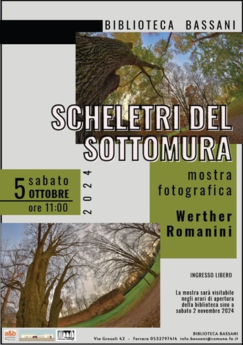FERRARA – È dedicata ai grandi alberi che, a Ferrara, fiancheggiano le Mura degli Angeli la mostra fotografica di Werther Romanini “Scheletri del sottomura”, che sabato 5 ottobre 2024 alle 11 sarà inaugurata alla biblioteca comunale Bassani di via Grosoli 42 (Barco, Ferrara). L’esposizione rimarrà visitabile fino al 2 novembre 2024, negli orari di apertura della biblioteca (da martedì a sabato dalle 9 alle 13 e martedì, mercoledì e giovedì anche dalle 15 alle 18,30).