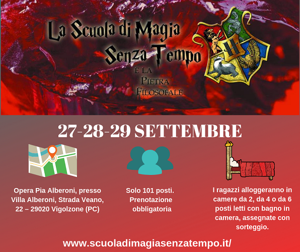 VIGOLZONE (PC) – Si svolgerà il 27-28-29 settembre a Vigolzone (PC) la Scuola di Magia Senza Tempo bellissimo evento dedicato ai bambini e alla magia con pernottamento presso Villa Alberoni, Strada Veano, 22.