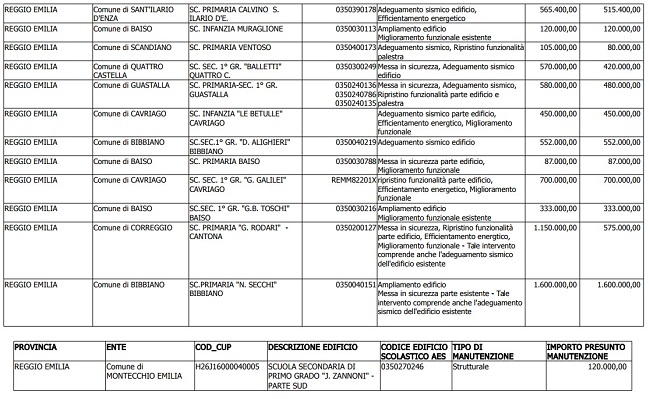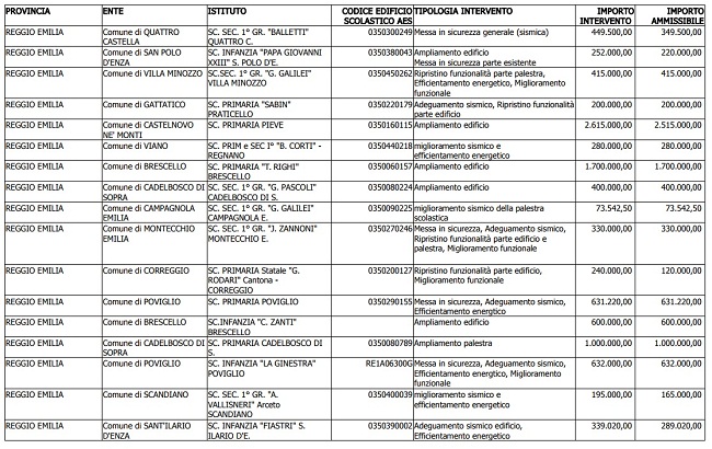 “Si tratta in massima parte di primarie e secondarie di primo grado, ma anche di alcune scuole dell’infanzia, che potranno beneficiare di adeguamenti sismici, efficientamenti energetici e opere di miglioramento a conferma di un impegno a favore della sicurezza delle nostre scuole che la Provincia di Reggio Emilia, nonostante le difficoltà di questi ultimi anni, è comunque riuscita a garantire grazie in particolare ad una capacità progettuale che ha permesso di attingere da diversi canali di finanziamento raggiungendo una somma decisamente ragguardevole”, aggiunge il presidente Giammaria Manghi.