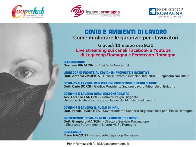 Il webinar verrà trasmesso su tutti i canali social di Legacoop Romagna. È stato promosso per migliorare le conoscenze delle cooperative sui comportamenti da tenere per tutelare i lavoratori in esse occupati. L’obiettivo è di conoscere a fondo quali sono le misure di contenimento del rischio di contagio per il rispetto di protocolli e linee guida e quali nessi di causalità possano insorgere tra danno e prestazione lavorativa in caso di contagio.