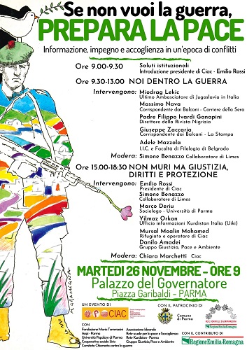 L’incontro, organizzato da Ciac, ha ottenuto il patrocinio del Comune di Parma e il contributo della Regione Emilia-Romagna e della Rete regionale contro le discriminazioni. Inoltre è promosso in collaborazione con la Fondazione Mario Tommasini, l’Anpi di Parma, l’Università Popolare di Parma, la Cooperativa Sociale Sirio, il Comitato Chiamata contro la Guerra, l’Associazione Ideando, la Rete scuole per la pace e l’accoglienza, Rete Kurdistan-Parma e il Gruppo Giustizia, Pace e Ambiente.