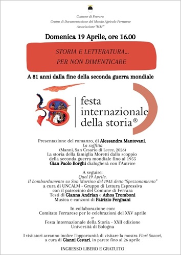 FERRARA – Due eventi a 81 anni dalla fine della Seconda guerra mondiale sono in programma per domenica 19 aprile 2026, dalle 16:00, il MAF di San Bartolomeo in Bosco. Il progetto, ritenuto di elevato interesse culturale, è stato inserito nei calendari ufficiali della XXII Festa Internazionale della Storia, promossa dall’Università di Bologna, e del Comitato ferrarese per le Celebrazioni del XXV Aprile.