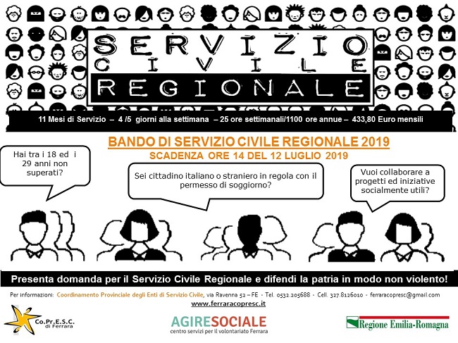 Il Bando di Servizio Civile Regionale – che è stato presentato lo scorso martedì 2 luglio 2019 nella sede di Agire Sociale-Csv di Ferrara (via Ravenna 52 a Ferrara) con una buona partecipazione di giovani – prevede, quest’anno, il reclutamento di 152 volontari nell’ambito della regione Emilia Romagna di cui 16 sulla provincia di Ferrara. I giovani selezionati prenderanno servizio a partire da settembre 2019.