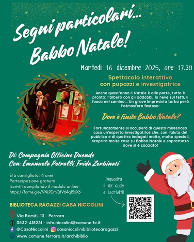 FERRARA – Dov’è finito Babbo Natale? Per scoprirlo e risolvere il caso della misteriosa scomparsa, martedì 16 dicembre 2025 alle 17:30, alla biblioteca comunale Casa Niccolini (via Romiti 13, Ferrara) Emanuela Petralli, Frida Zerbinati di Compagnia Officine Duende porteranno in scena lo spettacolo interattivo con pupazzi e investigatrice “Segni particolari… Babbo Natale!”.