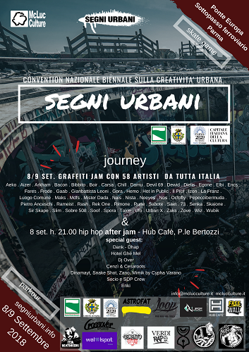 .8/9 Settembre jam di graffiti 50 artisti presso sottopasso ferroviario .8/9 Settembre game of skate, a premi presso sottopasso ferroviario .8/9 settembre parkour presso sottopasso ferroviario .8 settembre Cena buffet e concerto hip hop dalle h. 21.00 presso Hub Cafè in P.le Bertozzi, Parma facebook.com/events/190990968189580 Special Guest: