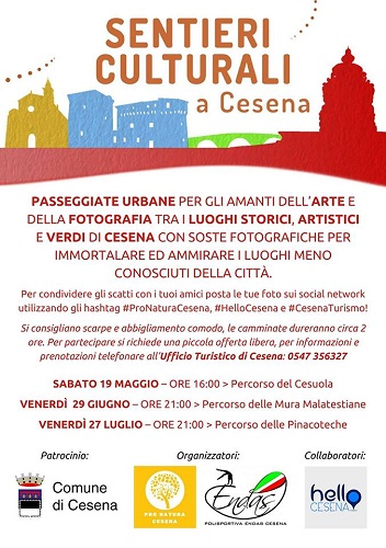 CESENA – Sabato 19 maggio torna “Sentieri culturali”, l’iniziativa che unisce amanti dell’arte e della fotografia per una passeggiata urbana immersa tra i luoghi storici, artistici e verdi di Cesena. Il percorso, che prevede anche soste fotografiche per immortalare i luoghi meno conosciuti della città, andrà questa volta alla scoperta del percorso del torrente Cesuola. L’appuntamento è organizzato dall’organizzazione Pro Natura Cesena e dalla Polisportiva Endas, in collaborazione con l’Ufficio Turistico di Cesena ed Hello Cesena.