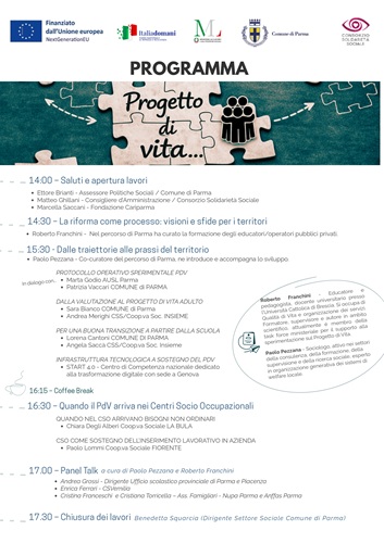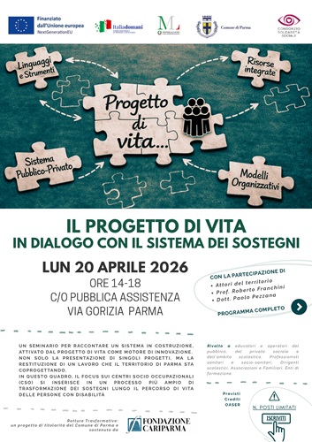 PARMA – Lunedì 20 aprile 2026, alle ore 14.00, presso la Pubblica Assistenza – Sala stampa Luigi Anedda (via Gorizia 2/a), si svolgerà il seminario “Il progetto di vita in dialogo con il sistema dei sostegni”. L’incontro sarà l’occasione per la restituzione di un lavoro di co-progettazione che il territorio di Parma sta sviluppando in modo condiviso. In questo quadro, l’attenzione sui Centri socio occupazionali (CSO) si inserisce all’interno di un processo più ampio di trasformazione dei sostegni lungo il percorso di vita delle persone con disabilità.