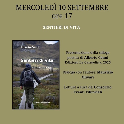 FERRARA – Affrontano i temi chiave del destino umano le poesie raccolte nel libro di Alberto Cenni “Sentieri di vita” realizzata da (Edizioni La Carmelina, 2025) che mercoledì 10 settembre 2025 alle 17:00 sarà presentao nella sala Agnelli della biblioteca comunale Ariostea (via delle Scienze 17, Ferrara).