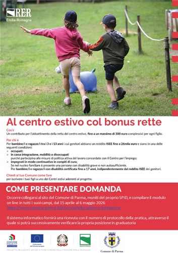 Attraverso questa misura, il Comune di Parma offre alle famiglie residenti un sostegno concreto ai costi di partecipazione ai servizi estivi, favorendo l’accesso alle opportunità educative e ricreative durante il periodo estivo.