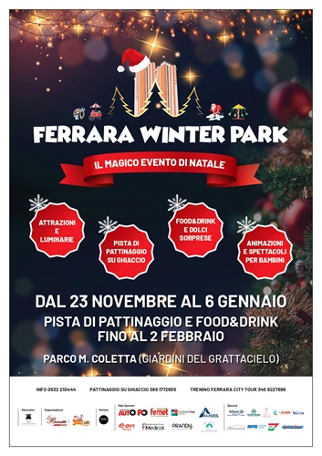 L’evento è realizzato dal Comune di Ferrara in collaborazione con l’Agenzia Studio Borsetti. “È una grande soddisfazione – interviene Nicola Borsetti – poter tornare al parco Coletta con la quarta edizione del Ferrara Winter Park. Un evento partito nel 2021 e che anno dopo anno ha saputo rinnovarsi e consolidarsi nel vasto panorama degli eventi natalizi della città, grazie anche alla partecipazione e al prezioso supporto di sponsor e partner che ringrazio sentitamente. Dopo il successo delle precedenti edizioni, Ferrara Winter Park conferma ancora una volta di avere i requisiti per assicurare interessanti opportunità di divertimento, aggregazione, svago e socialità in modo trasversale: anche quest’anno attrazioni, luminarie, pista di pattinaggio su ghiaccio, food&drink e dolci sorprese, animazioni e spettacoli per bambini”.