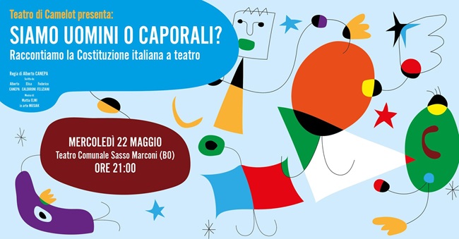 SASSO MARCONI (BO) – Dopo una lunga pausa per la pandemia e di assenza dalle scene, il Teatro di Camelot, attori e disabili professionisti, riparte da Sasso Marconi, con il riallestimento dello spettacolo “Siamo uomini o caporali? Raccontiamo la Costituzione italiana a teatro” in programma mercoledì 22 maggio alle ore 21.00.