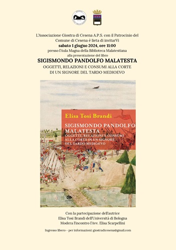 CESENA – Le vicende italiane del tardo Medioevo e le contraddizioni di un’epoca di passaggio approdano in Biblioteca Malatestiana in occasione della presentazione del libro “Sigismondo Pandolfo Malatesta. Oggetti, relazioni e consumi alla corte di un Signore del tardo Medioevo” (Jouvence, 2020) di Elisa Tosi Brandi, dottoressa di ricerca in Storia medievale e docente dell’Università di Bologna. L’appuntamento è per sabato 1° giugno, alle ore 11.00, nell’Aula Magna della Malatestiana e si inserisce nelle iniziative proposte alla città dall’Associazione Giostra di Cesena che, in questo modo, accompagna cesenati e appassionati all’atteso appuntamento con la manifestazione cavalleresca che domenica 15 settembre allieterà piazza del Popolo.