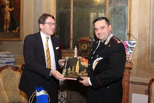 Dopo una rapida visita alle Sale storiche, in cui si sono soffermati davanti alla Secchia rapita, il sindaco ha dato il benvenuto al nuovo comandante anche a nome della cittadinanza consegnandogli un volume dedicato proprio al Palazzo comunale.