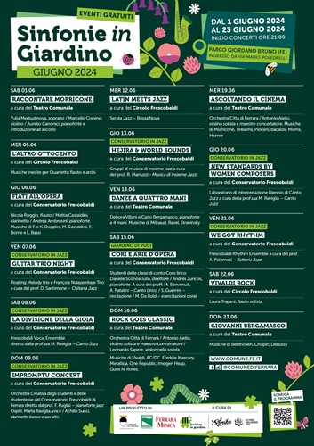 FERRARA – Un palco collocato sotto i grandi alberi storici del Parco Giordano Bruno, sulla sinistra del sentiero che si apre su via Poledrelli nel quartiere Giardino di Ferrara, accoglierà la rassegna “Sinfonie in giardino” in programma con concerti di musica classica, jazz e contaminazioni rock da sabato 1 giugno fino a domenica 23 giugno 2024.