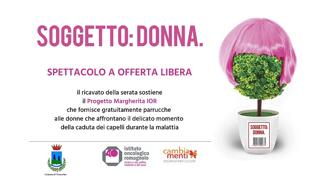 VERUCCHIO (RN) – Il Teatro E. Pazzini di Verucchio SABATO 14 DICEMBRE alle ore 21.00 ospita lo spettacolo “SOGGETTO: DONNA”, esito del laboratorio teatrale condotto da Alexia Bianchi in collaborazione con l’associazione culturale Cambia-Menti dedicato all’approfondimento delle tematiche legate agli stereotipi di genere. Lo spettacolo è a OFFERTA LIBERA e il ricavato della serata sostiene il Progetto Margherita IOR – Instituto Oncologico Romagnolo che fornisce gratuitamente parrucche alle donne che affrontano il delicato momento della caduta dei capelli durante la malattia. Il Progetto Margherita IOR consiste in un incontro durante il quale le signore possono scegliere una parrucca grazie al supporto di un parrucchiere volontario e di un volontario IOR che si mettono al loro servizio offrendo ascolto, accoglienza e professionalità.