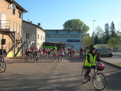 Gli alunni a scuola in bici con il cappellino rosa