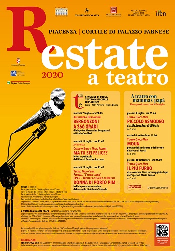PIACENZA – Ritorna il teatro a Piacenza con “R-ESTATE A TEATRO”, la rassegna estiva 2020 di Teatro Gioco Vita con Fondazione Teatri e Comune di Piacenza e il sostegno di Fondazione di Piacenza e Vigevano e Iren. Cartellone che segna la ripresa dello spettacolo dal vivo dopo che dal 22 febbraio scorso è stata sospesa l’attività e annullata la programmazione della Stagione di Prosa e del Teatro Ragazzi prevista in questi mesi.