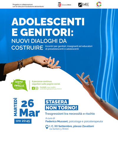 Il percorso terminerà nel mese di Aprile con l’ultimo incontro, di seguito il link al calendario completo: https://www.comune.rimini.it/servizi/adolescenza-centro-le-famiglie?fbclid=IwAR3LxpU0QpoKZx-BQLSQMt-w6obzlLRKUuFEdIKPOoEsit-SpBM02vNzluA