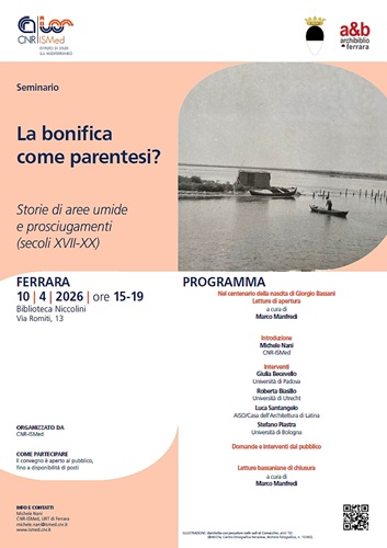 FERRARA – Proporrà un approfondimento sul tema “La bonifica come parentesi? Storie di aree umide e prosciugamenti (secoli XVII-XX)” il seminario a cura di CNR-ISMed che venerdì 10 aprile 2026, alle 15:00, sarà ospitato dalla biblioteca comunale Casa Niccolini (via Romiti 13, Ferrara).
