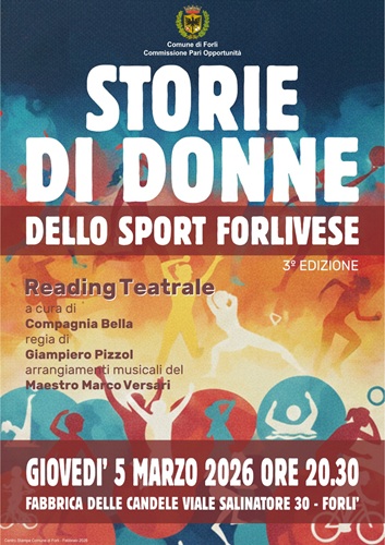 FORLÌ – Giovedì 5 marzo andrà in scena alle ore 20.30, presso la Fabbrica delle Candele, in viale Salinatore n. 30, il reading teatrale “Storie di Donne dello sport forlivese”, a cura della compagnia teatrale “Compagnia Bella”, con la regia di Giampiero Pizzol.