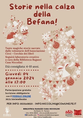 FERRARA – Si intitola “Storie nella calza della Befana” l’appuntamento con le letture ad alta voce e il laboratorio creativo per bambini dai 4 ai 10 anni in programma per giovedì 4 gennaio 2024 alle 17 alla Biblioteca per ragazzi Casa Niccolini (via Romiti 13, Ferrara).