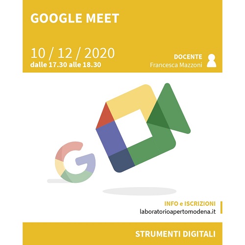 MODENA – Giovedì 10 dicembre alle 17.30 sarà Google Meet il tema del nuovo appuntamento online con i webinar di “Strumenti digitali”, incontri aperti a tutti e gratuiti, per approcciarsi agli strumenti più utili a rimanere connessi da casa in tempi di pandemia. Francesca Mazzoni farà conoscere ai partecipanti, individuandone i pregi e i possibili utilizzi, lo strumento Gsuite Google Meet, applicazione dalle molte funzionalità utile sia per comunicazioni private, sia per riunioni aziendali, sia per didattica a distanza.