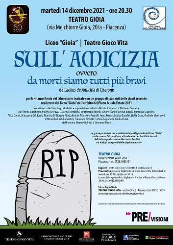 PIACENZA – Una messa in scena ispirata al “Laelius de Amicitia” di Cicerone, esito di un nuovo importante progetto nato dalla collaborazione tra il Liceo “Gioia” e Teatro Gioco Vita. La propone un gruppo di studenti delle classi seconde che hanno partecipato a un laboratorio teatrale organizzato dall’istituto diretto da Cristina Capra nell’ambito del Piano Scuola Estate 2021 e affidato al centro di produzione teatrale diretto da Diego Maj. Si tratta di “Sull’amicizia ovvero Da morti siamo tutti più bravi”, creazione collettiva degli studenti con la supervisione artistica di Nicola Cavallari e Miche Zaccaria. Appuntamento martedì 14 dicembre alle ore 20.30 al Teatro Gioia. In scena Emma Bacchetta, Valeria Belcova, Lucrezia Bertocchi, Margherita Bonelli, Chiara Bonini, Letizia Burgio, Tommaso Capellini, Alice Carini, Francesca Del Sante, Martina Di Nunzio, Giada Eventi, Massimo Fariselli, Anna Ferrari, Marta Gavello, Stella Grazi, Rachele Maestroni, Vittoria Rasi, Giulia Sartori, Francesca Silvestri, Letizia Tagliaferri, Giulia Vidali. La parte tecnica è curata da Marco Gigliotti e Giovanni Mutti.