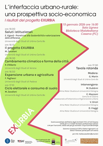 CESENA – Giovedì 15 gennaio, alle ore 16:00, la sala Lignea della Biblioteca Malatestiana ospiterà l’incontro pubblico dedicato alla presentazione dei risultati del progetto ‘Exurbia’, dal titolo ‘L’interfaccia urbano-rurale: una prospettiva socio-economica’. Nel corso del pomeriggio saranno approfonditi i principali esiti della ricerca incentrata sulle trasformazioni in atto nei territori di confine tra città e campagna, analizzandone le implicazioni socio-economiche, ambientali e urbanistiche. Un tema di grande attualità, che chiama in causa il rapporto tra sviluppo urbano, consumo di suolo, agricoltura e cambiamento climatico, nonché il ruolo delle politiche pubbliche e dei cicli decisionali.