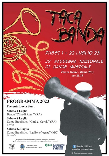 RUSSI (RA) – Torna anche quest’anno dall’ 1 al 22 luglio il TACABANDA, la tradizionale rassegna nazionale di bande musicale, giunta quest’anno alla sua 25^ edizione, che si svolgerà a luglio in piazza Dante a Russi.