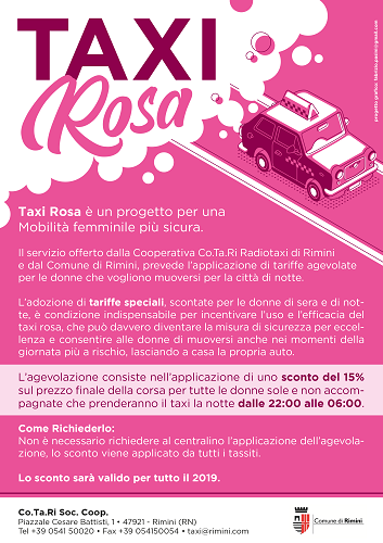 Il servizio è offerto dalla Cooperativa Co.Ta.Ri Radiotaxi di Rimini e dal Comune di Rimini, prevede l’applicazione di tariffe agevolate per le donne che vogliono muoversi per la città di notte.
