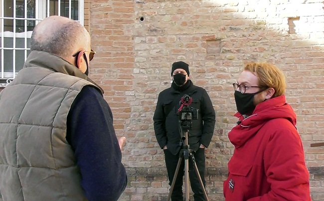 (N.B. La foto di gruppo al Teatro Filodrammatici è stata scattata a settembre alla ripresa del laboratorio teatrale in presenza, le altre fotografie si riferiscono alle riprese delle interviste di “Teatro, amore e fantasia”)
