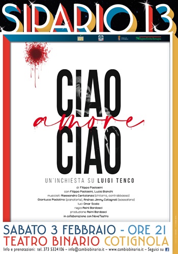 «Ciao amore ciao si muove tra musica, parole e ricerca storica attorno alla figura di Luigi Tenco» spiega l’autore e interprete Filippo Paolasini «Il racconto della vita di un cantautore romantico e dannato, il suo sguardo glaciale, così vero da renderlo diverso dai colleghi finti e patinati dello star system della musica italiana del tempo. Il suo è stato un suicidio o un omicidio? Rimane certo che la sua esistenza in vita abbia donato a tutta la musica italiana un’immensa eredità artistica».