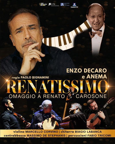 Gli Ànema, con la partecipazione straordinaria di Enzo Decaro, rendono omaggio, con lo spettacolo Renatissimo, in scena al Teatro Comunale Walter Chiari di Cervia, giovedì 8 e venerdì 9 gennaio alle ore 21, ad uno dei più grandi autori ed interpreti della scena musicale napoletana e italiana del secondo Novecento, Renato Carosone. La regia è di Paolo Bignamini.