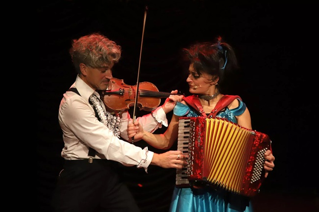 In “Kalinka” la musica dal vivo si intreccia con gags, tormentoni e giocolerie. E così i confini tra acrobazie, azione e musica sono completamente dissolti. Lo spettacolo è un viaggio nei personaggi del circo tradizionale, nel quale Nando e Maila portano in scena una carica ludica e tenera che innerva screzi, frecciate, dispetti e che si arricchisce man mano di poesia. Duettano con contorsionismi musicali, quando abbracciati ballano un tango mentre suonano fisarmonica e violino. Attraverso la clownerie musicale va così in scena la storia di una coppia di artisti che ha del felliniano: lui è uno sgangherato impresario-presentatore-spalla, lei è una non meno pasticciona primadonna venuta-scappata-scacciata, vai a capire, dalla grande tradizione circense dell’est Europa. Una miscela irresistibile di circo, teatro, musica, ironia, creatività e tanto altro. Di e con Ferdinando D’Andria e Maila Sparapani, collaborazione artistica Carlo Boso, disegno luci e audio Federico Cibin, scenografie Ferdinando D’Andria, regia Luca Domenicali.
