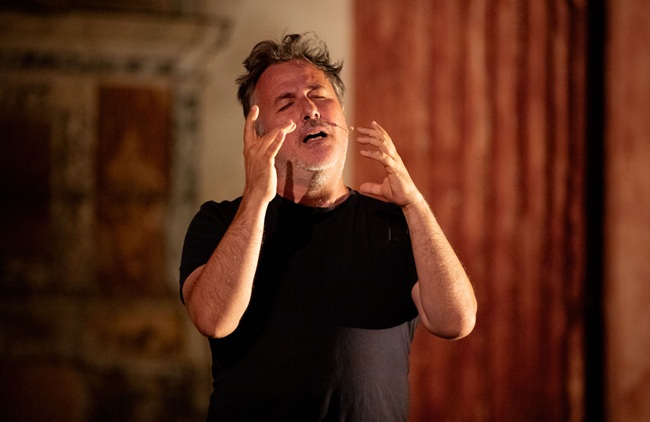 Lo spettacolo poi prenderà in esame un caso particolare, un vero e proprio spartiacque nella coscienza collettiva: il rapimento e l’omicidio di Giuseppe di Matteo, il bambino figlio di un collaboratore di giustizia, rapito, tenuto per 778 giorni in prigionia in condizioni spaventose e infine ucciso per strangolamento per poi venire sciolto nell’acido. Una storia disumana che si configura come l’apparizione del male, il sacro nella sua declinazione di tenebra. Siamo in presenza dell’orrore, di una ferocia smisurata, di una linea di azioni così abiette da essere impossibile ogni aggettivazione. E su tutto vibra il sacrificio di una vittima innocente. La verticalità della vicenda ha in sé tutti i requisiti della tragedia, soprattutto nella formulazione di domande che non possono avere risposte. Gli strumenti linguistici a disposizione per affrontare questo lavoro sono quelli che il vocabolario teatrale ha costruito nella mia Palermo: il corpo, il canto, il dialetto, il pupo, la recitazione, il cunto. È dentro questo linguaggio circoscritto che questo problema linguistico va affrontato, sviscerato, interrogato, risolto. Questo nuovo lavoro è una tragedia, una orazione civile, un processo di autoanalisi personale e condiviso, un confronto con lo Stato, una serie di domande a Dio in persona. Per questo, questo lavoro è un autoritratto al contempo intimo e collettivo”. (Davide Enia)