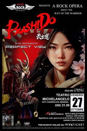 MODENA – Debutterà il 27 ottobre 2023 alle ore 21.00 presso il Teatro Michelangelo di Via Pietro Giardini 255, Modena, “Bushido” l’opera rock ideata dai Perfect View. La band interpreterà dal vivo l’omonimo concept album – pubblicato in primavera con Lions Pride Music – ma la narrazione musicale sarà integrata da quella visiva di immagini suggestive che, ispirandosi ai manga giapponesi, racconteranno i momenti salienti della storia del protagonista Koji, nonché da quella attoriale, grazie alla magnifica voce di Ruggero Andreozzi.