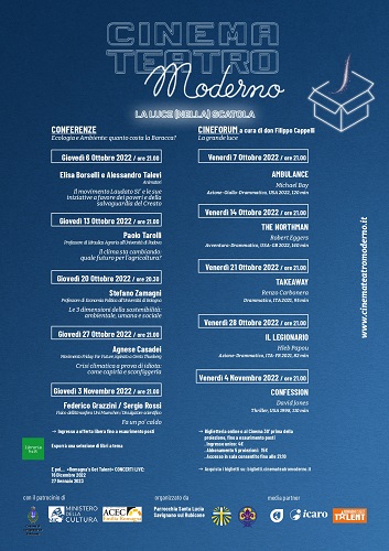 SAVIGNANO SUL RUBICONE (FC) – Prosegue al Cinema Teatro Moderno di Savignano sul Rubicone la rassegna “La luce nella scatola”, appuntamenti con le conferenze del giovedì sera e il cineforum di venerdi di autunno.