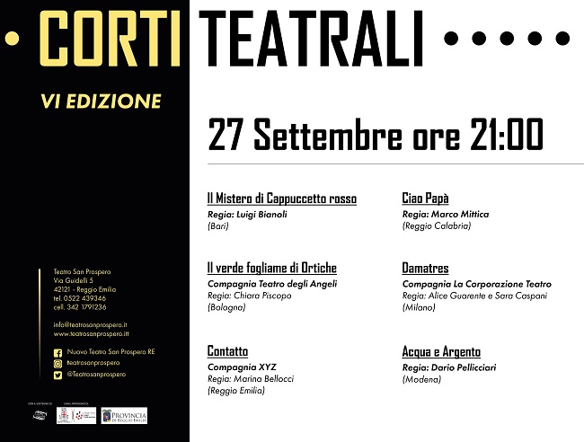 Dopo il successo della prima serata torna la seconda ed ultima semifinale del Concorso Nazionale Corti Teatrali, domenica 27 settembre alle ore 21.00 presso il Teatro San Prospero.