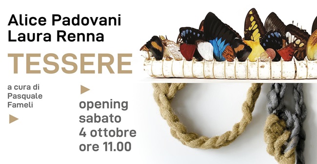 La parola scelta per legittimare questo confronto è “tessere”, da intendersi in una doppia accezione: gli elementi costitutivi del mosaico e l’atto di intrecciare i fili. Sono i due fattori che caratterizzano le pratiche delle rispettive artiste, volte ad accostare, nel primo caso, e a ordire, nel secondo. Frammenti di oggetti comuni, insetti, materiale organico, diventano infatti, nella ricerca di Alice Padovani, le tessere di un mosaico astratto e variegato che raggiunge talvolta esiti scultorei e installativi. Filati di lana rigenerata, lana d’acciaio, cashmere e altri materiali si intrecciano invece nelle opere di Laura Renna per dare vita a bulbi, rizomi e acrocori capaci di adattarsi a ogni ambiente e di aderire a qualsiasi superficie.