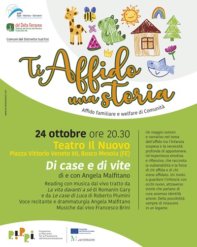 “Ti Affido una storia – Un viaggio nel cuore dell’affido” è un progetto di sensibilizzazione che porta sul palco il tema dell’accoglienza e della cura attraverso il linguaggio del teatro e la forza delle storie vere. Due appuntamenti, ad Argenta e Bosco Mesola, per avvicinare il pubblico al mondo dell’affido familiare e alla sua profonda dimensione umana.