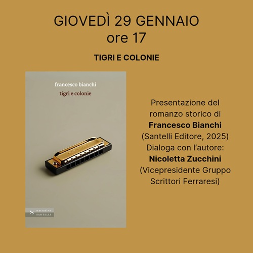 FERRARA – Si snodano sullo sfondo della storia del colonialismo italiano, le vicende familiari raccontate da Francesco Bianchi nel romanzo dal titolo “Tigri e colonie” (Santelli Editore, 2025) che giovedì 29 gennaio 2026 alle 17:00 sarà presentato nella sala Agnelli della biblioteca comunale Ariostea (via delle Scienze 17, Ferrara).
