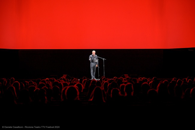 Grande successo per il teatro: l’11 e 12 dicembre la Sala Granturismo ha ospitato il doppio appuntamento con Toni Servillo, protagonista di “Partitura – Viaggio immaginario, e ostile, di Giacomo Leopardi nel ventre di Partenope”, testo che Enzo Moscato scrisse per lui nel 1987. Due serate intense e suggestive, in cui Servillo ha dato voce e corpo alla Napoli dolente e febbrile immaginata da Moscato, trascinando il pubblico in un affresco emotivo potente e coinvolgente. L’appuntamento con Servillo si è arricchito nel pomeriggio di venerdì con la proiezioni al Cinepalace, della versione restaurata di Rasoi, il film nato dall’innesto del poemetto Litoranea e da alcune pagine di Partitura. In sala erano presenti Toni Servillo e Angelo Curti in dialogo con Daniele Gualdi, presidente di Riccione Teatro.