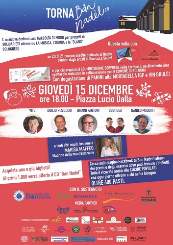 BOLOGNA – Una nuova originale edizione, la terza, per “Ban Nadèl”l’iniziativa dedicata alla raccolta di fondi per progetti di solidarietà attraverso la musica, l’ironia e lo “slang” bolognese. Questa volta con un CD di canzoni inedite dedicate al Natale e una estrazione di premi (oltre 70 quelli in palio), il cui ricavato sarà interamente a favore delle Cucine Popolari, nella cornice di un divertentissimo spettacolo in Piazza Lucio Dalla Giovedì 15 Dicembre alle ore 18.30.