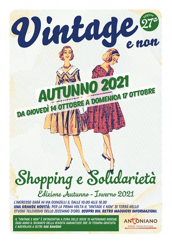 BOLOGNA – Dal 14 al 17 ottobre torna l’iniziativa “Vintage e non” dell’Antoniano di Bologna. Al mercatino solidale sarà possibile acquistare abiti e accessori vintage per tutte le età per aiutare i bimbi con fragilità fisiche e cognitive a superare i momenti difficili e a costruire un futuro più sereno.