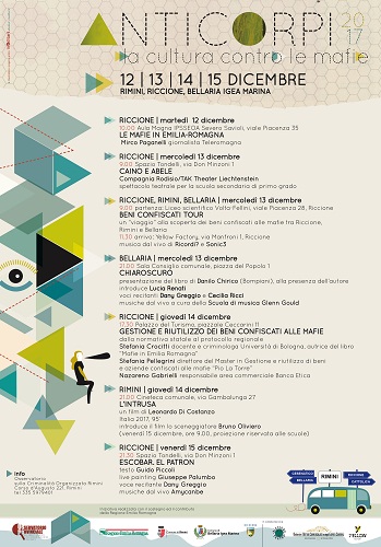 RIMINI – Torna, dal 12 al 15 dicembre, il Festival Anticorpi: quattro giorni per riflettere sulle mafie e la loro diffusione, grazie agli incontri, ai seminari e agli spettacoli organizzati dall’Osservatorio sulla criminalità organizzata e per la diffusione di una cultura della legalità della Provincia di Rimini.